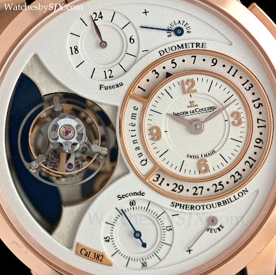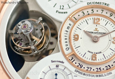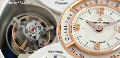 Nach JLC sind die Zwillingsfässer für eine überlegene chronometrische Leistung notwendig, da der Sekundenzeiger zurückgesetzt werden kann, ohne die Amplitude des Tourbillons zu beeinträchtigen. Ich bin etwas skeptisch darüber, da die Sekunden zurücksetzen ist ein kleines Merkmal, das nicht viel Drehmoment verwendet. Ich denke, die Sekunden zurücksetzen können mit einem einzigen Fass und kein Tropfen Amplitude erreicht werden.