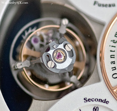 Eine Achse ist auf dem Balance-Rad zentriert und die andere ist in einem Winkel geneigt, der dem Tourbillon-Käfig eine Bewegung wie die eines Spinners gibt. Es ist eine Schande, dass das Tourbillon nur durch das Zifferblatt gesehen werden kann. Es gibt keine Saphir-Öffnung in der Fall-Seite wie das, was Greubel Forsey tut .