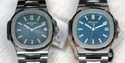 Gefühl blau aber heller Obwohl beide Zifferblätter die gleiche Marke horizontale Guilloche teilen, ist das Zifferblatt des Platinmodells ein ganz anderer Schatten von Blau. Während die Stahlversion ein abgestuftes Grau-Blau ist, das sich zum Rand des Zifferblatts verdunkelt, ist das Platin-Modell ein helles, lebendiges Blau. Andere Unterschiede in der Zifferblatt sind subtiler, wie der Weißgoldrahmen um das Datumsfenster auf dem Platinmodell, das auf dem Stahl Nautilus fehlt.