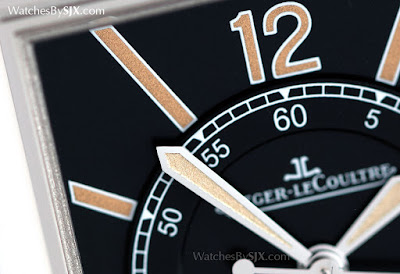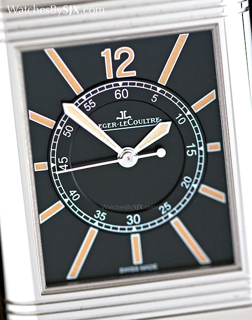Noch ungewöhnlicher ist die Mitte Sekunden, ein seltenes Feature für ein Reverso. Es ist modelliert auf einem Jahrgang Reverso aus den 1930er Jahren mit einem ähnlichen Zifferblatt, mit langen Taktstock-Indizes für die Stunden und eine Eisenbahn Minute Track mit fünf Minuten Markierungen.