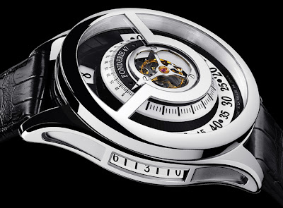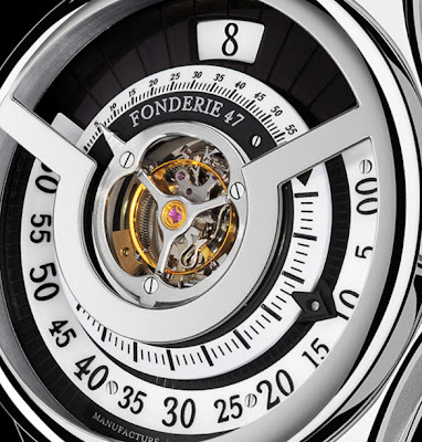 Um eine Umdrehung alle drei Minuten zu machen, hat der Inversion Principle Tourbillon Käfig drei Sekundenzeiger, von denen zwei immer unter dem Pistolenrahmen auf dem Saphirglas versteckt sind. Der sichtbare Sekundenzeiger fährt auf einer Skala von einem bis 60 auf dem oberen Drittel des Zifferblattes.